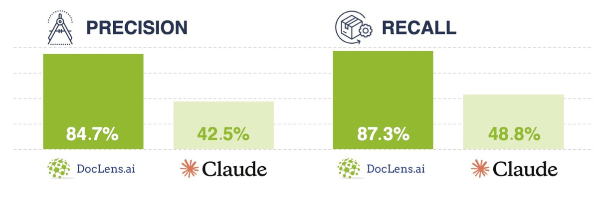 - Precision and Recall – Measure factual correctness. Errors are weighted differently depending on question type. For example, in Claim Summaries, incorrect names are penalized, while minor wording differences are tolerated in Risk Reports.