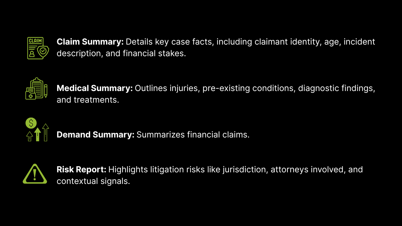 Claim files can run into hundreds of pages of medical records, legal filings, and correspondence. ClaimLens digests this information and produces structured outputs, such as: